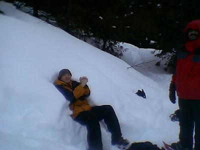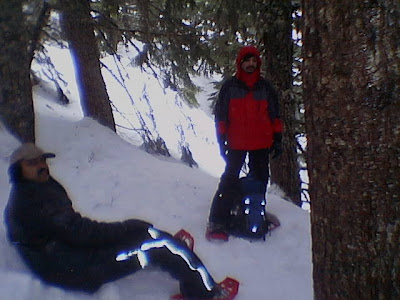 Despite the light rain on Saturday morning some colleagues and I decided to do a 3 mile snow shoeing trek to Mirror Lake and back. We got as high as 4100 feet and what we saw was well worth any perceived difficultly getting up there. Having Thomas' 14 year old son along helped bring out the young boys in all of us -especially as we took several shortcuts by sliding down from the summit (several hundred feet) on more than one occasion to save time ; What a thrill. Getting lost on the trail was almost exciting. My photos do no justice to the peace and calm that this place is. It is undisturbed, pristine, and the snow is so clean that it appears blue in daylight. I won't mention the other colored snow we passed left by an overly territorial bear ! Thanks to everyone who joined and hopefully we can plan something again soon !