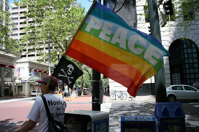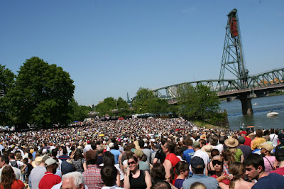 Barack Obama this afternoon near the SW Waterfront in Portland. I was on my regular weekend bike ride and found myself in the midst of the event. I don't think I've ever seen so many cyclists or people for that matter in a single place. I think this was the largest public event of any of the candidates thus far in the race - 70K + people; The line just stretched as far as the eye could see. An older gentleman standing near me said -- "The last time it felt like this was Bobby Kennedy in '68"; I'll take his word on it. I'm glad I had a chance to hear him speak - he is a great communicator. You can read the New York Times article